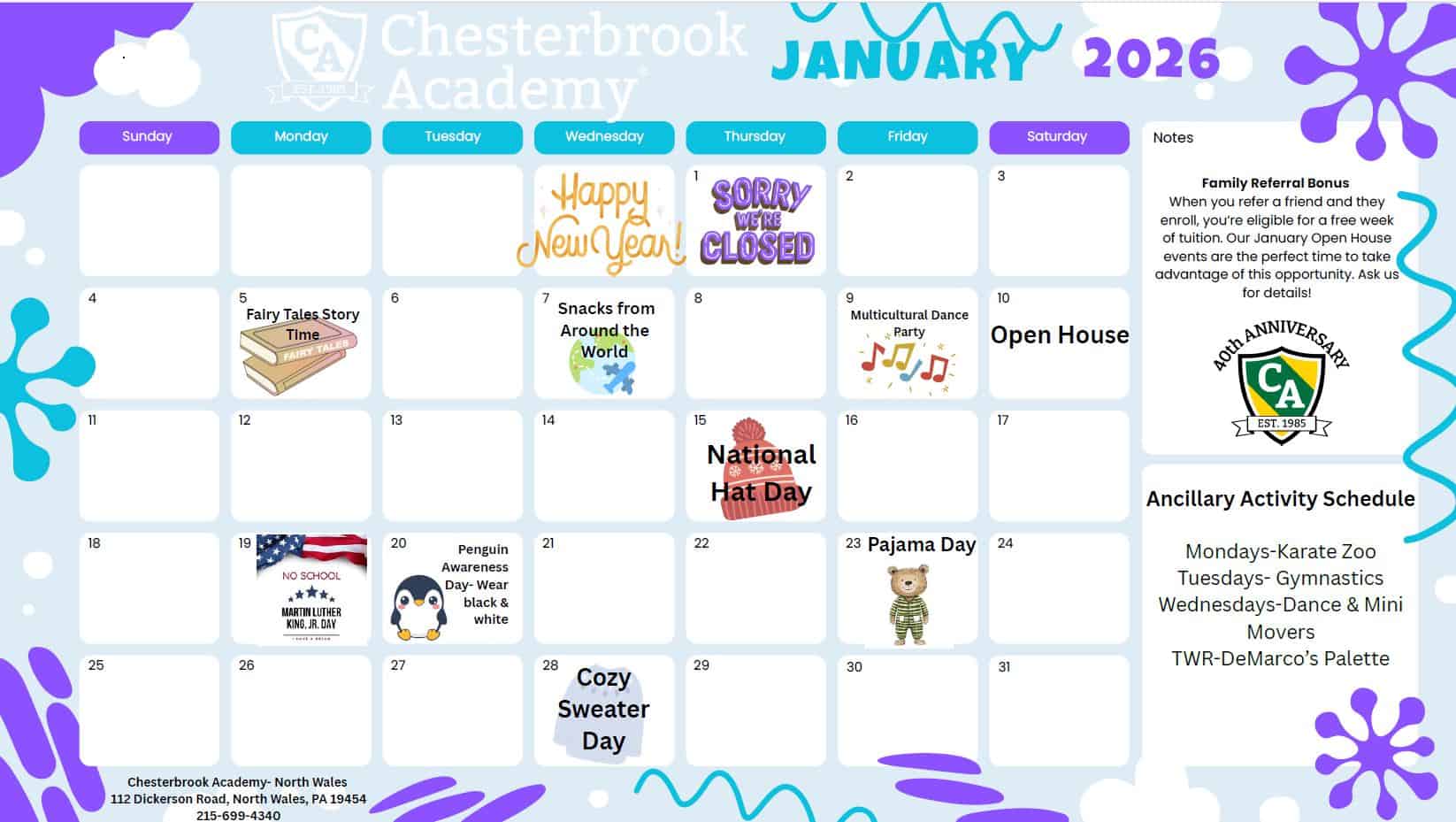 Calendars & Menu Home / For Parents / Calendars & Menu 2026 January Calendar January Menu 2025-2026 School Year Calendar December Menu January JanuaryFebruaryMarchAprilMayJuneJulyAugustSeptemberOctoberNovemberDecember 2026 202520262027 Sunday Monday Tuesday Wednesday Thursday Friday Saturday 28 29 30 31 1 Thursday, January 1, 2026 Happy New Year! – School Closed π 2 Friday, January 2, 2026 3 Saturday, January 3, 2026 4 Sunday, January 4, 2026 5 Monday, January 5, 2026 Fairy Tale Story Time π 6 Tuesday, January 6, 2026 7 Wednesday, January 7, 2026 Snacks from Around the World π Mini Movers πΆ 8 Thursday, January 8, 2026 9 Friday, January 9, 2026 Multicultural Dance Party πΆ 10 Saturday, January 10, 2026 11 Sunday, January 11, 2026 12 Monday, January 12, 2026 13 Tuesday, January 13, 2026 14 Wednesday, January 14, 2026 Mini Movers πΆ 15 Thursday, January 15, 2026 National Hat Day π 16 Friday, January 16, 2026 17 Saturday, January 17, 2026 18 Sunday, January 18, 2026 19 Monday, January 19, 2026 MLK Jr. Day- School Closed 20 Tuesday, January 20, 2026 π§Penguin Awareness Day- Wear black and white 21 Wednesday, January 21, 2026 Mini Movers πΆ 22 Thursday, January 22, 2026 23 Friday, January 23, 2026 Pajama Day 24 Saturday, January 24, 2026 25 Sunday, January 25, 2026 26 Monday, January 26, 2026 27 Tuesday, January 27, 2026 Tenure Tuesday π 28 Wednesday, January 28, 2026 Cozy Sweater Day Mini Movers πΆ 29 Thursday, January 29, 2026 30 Friday, January 30, 2026 31 Saturday, January 31, 2026 X Export Calendar Export Entire Calendar Start Date End Date Export Format iCal Download